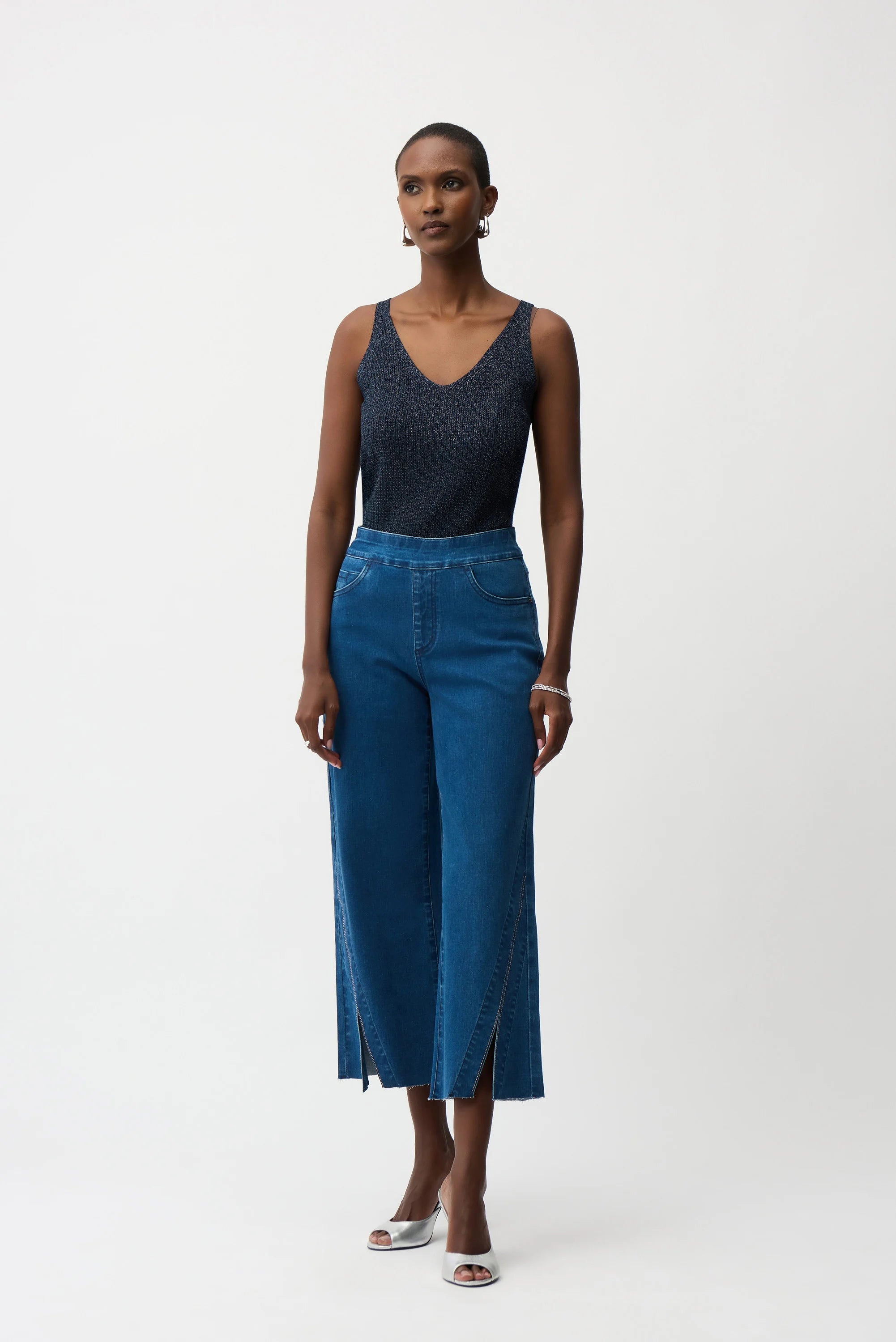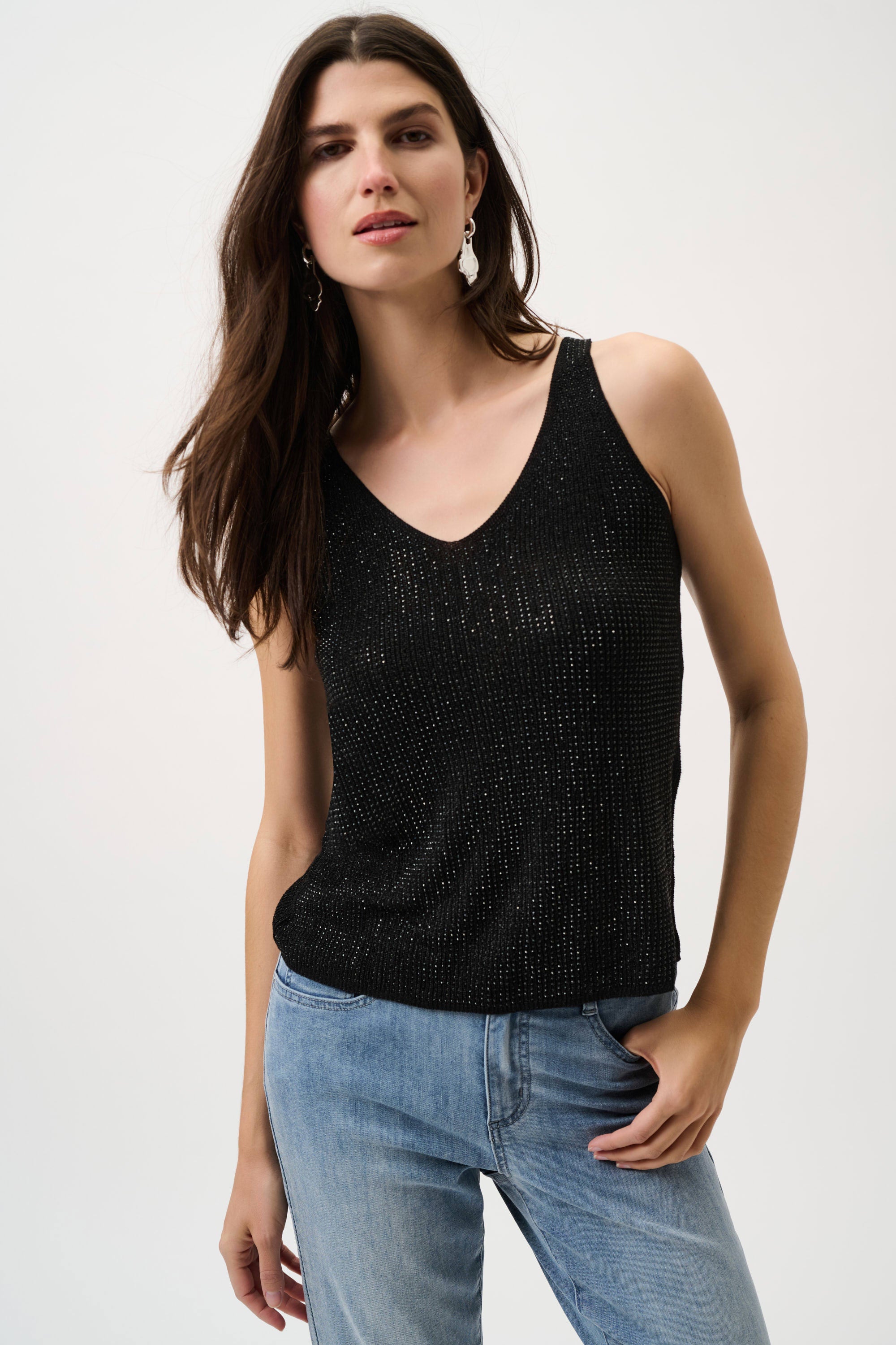 Experience effortless sophistication with this Joseph Ribkoff pullover. Crafted for a fitted, hip-length silhouette, it features a v-neckline adorned with jewels and ribbed detailing. Perfect for casual summer occasions, this sleeveless top combines plain chic style with a touch of elegance. Ideal for those who appreciate both comfort and style, this piece seamlessly blends casual and chic elements for a versatile wardrobe staple.