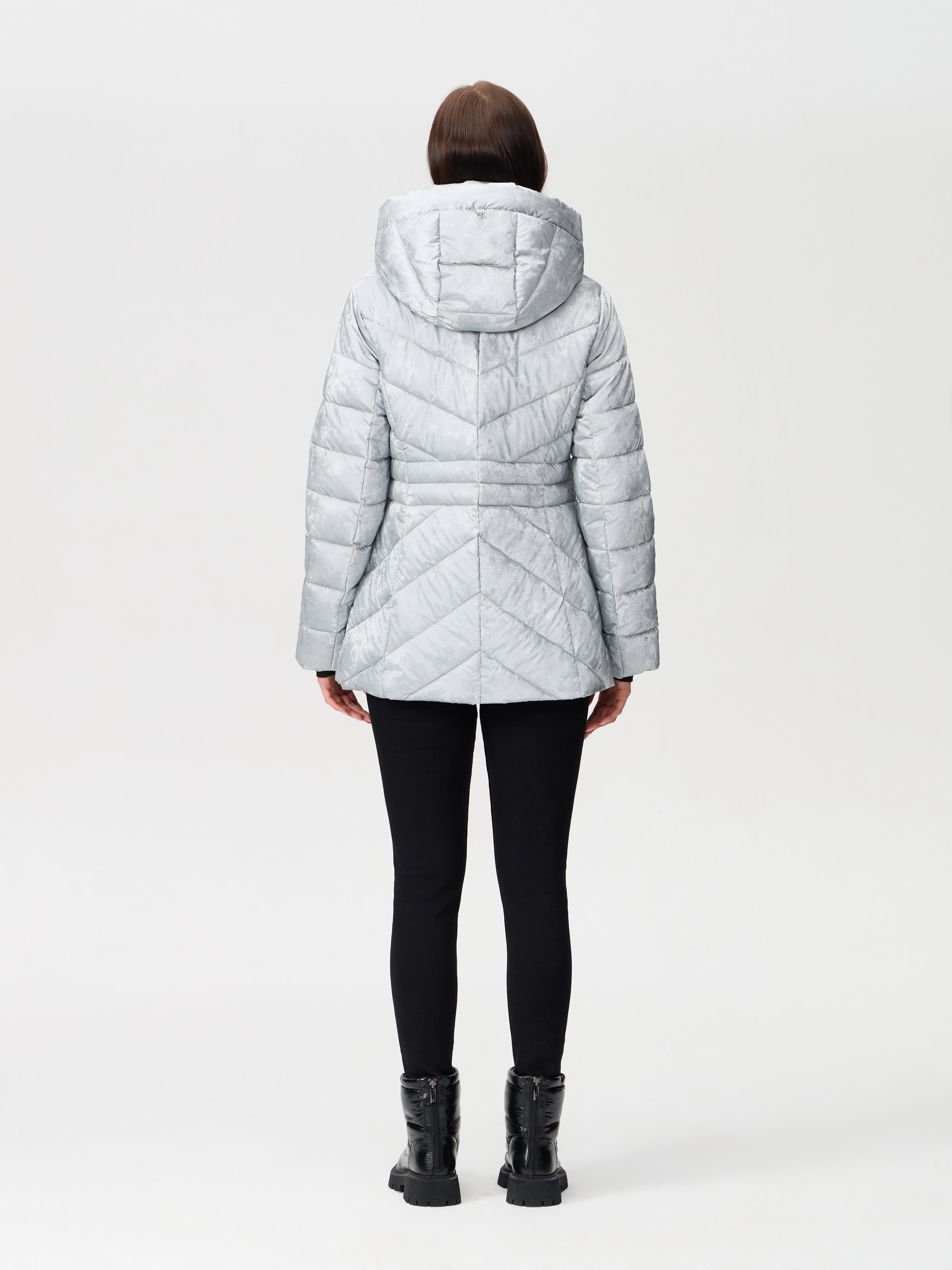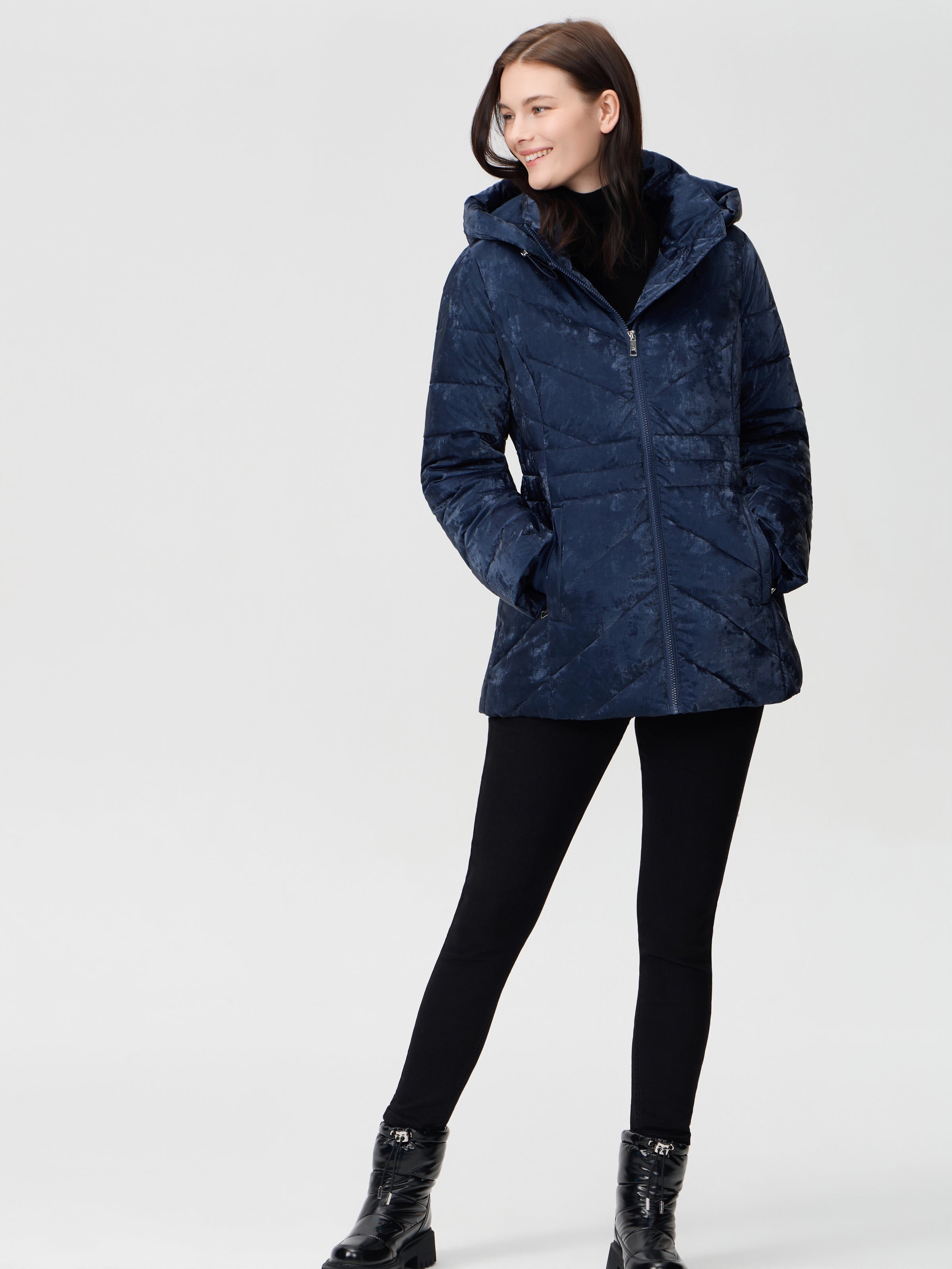 Detachable hooded pufer jacket in velvet shimmer fabric