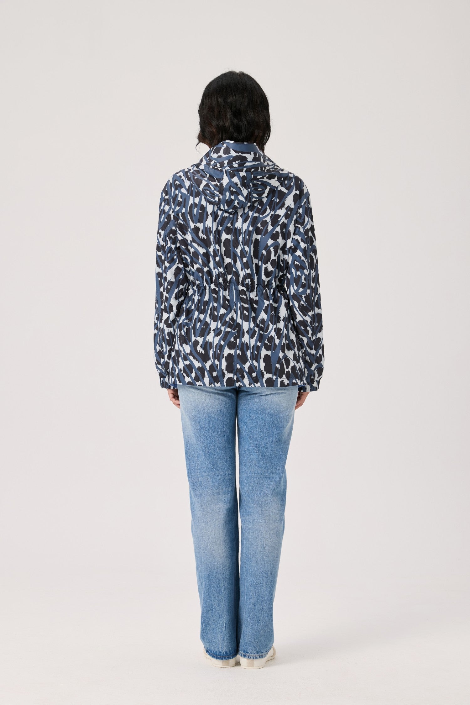 Reversible print to solid jacket with hidden hood