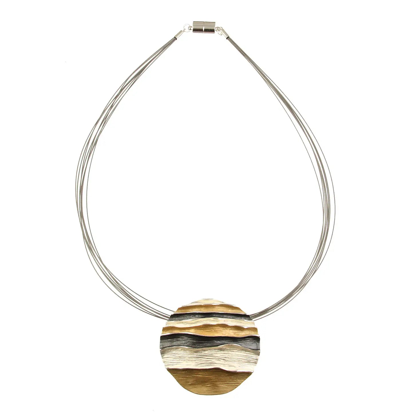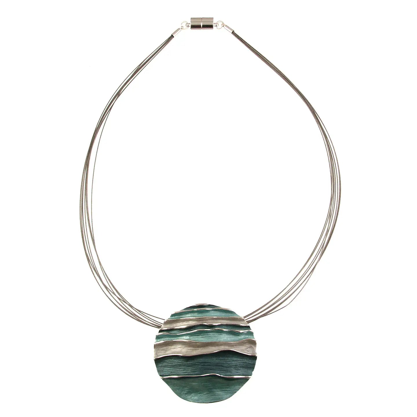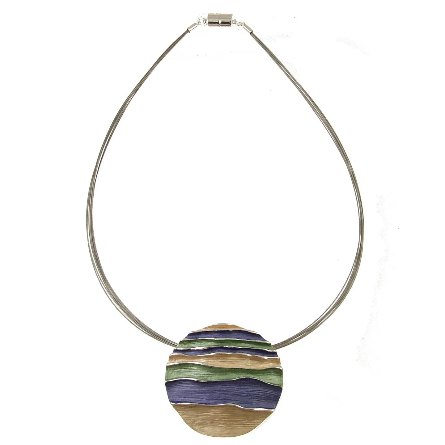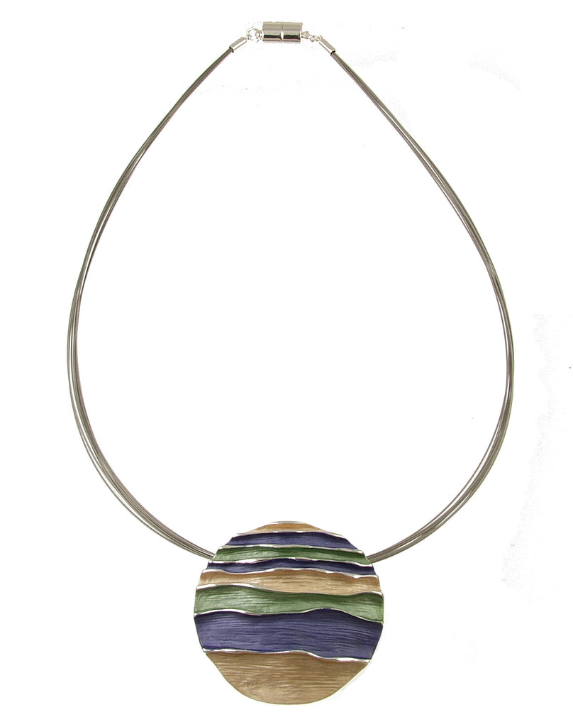 Bold, coastal charm! Capture the serene beauty of the sea with our Ocean Waves Round Emboss Pendant Necklace. This bold yet effortlessly wearable pendant features a 1-inch circumference with a captivating embossed wave design. Hypoallergenic and secured with a convenient magnetic closure, it's as comfortable as it is stylish. Choose from four evocative color palettes: calming shades of purple with hints of blue; the refreshing hues of turquoise and khaki-lime reminiscent of the ocean; a sophisticated blend of gold, silver, and cream; or a rich combination of purple with touches of gold and moss green. Strung on multiple delicate wires, this necklace will add a touch of coastal charm to any ensemble.