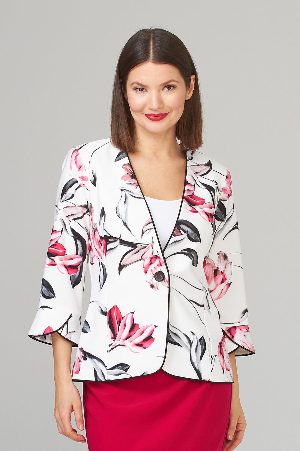 Floral print jacket designed by Joseph Ribkoff features solid piping detail on all hemlines, has an open front with one-button closure at the waistline, three-quarter length petal sleeve and hemline falls at the thigh.