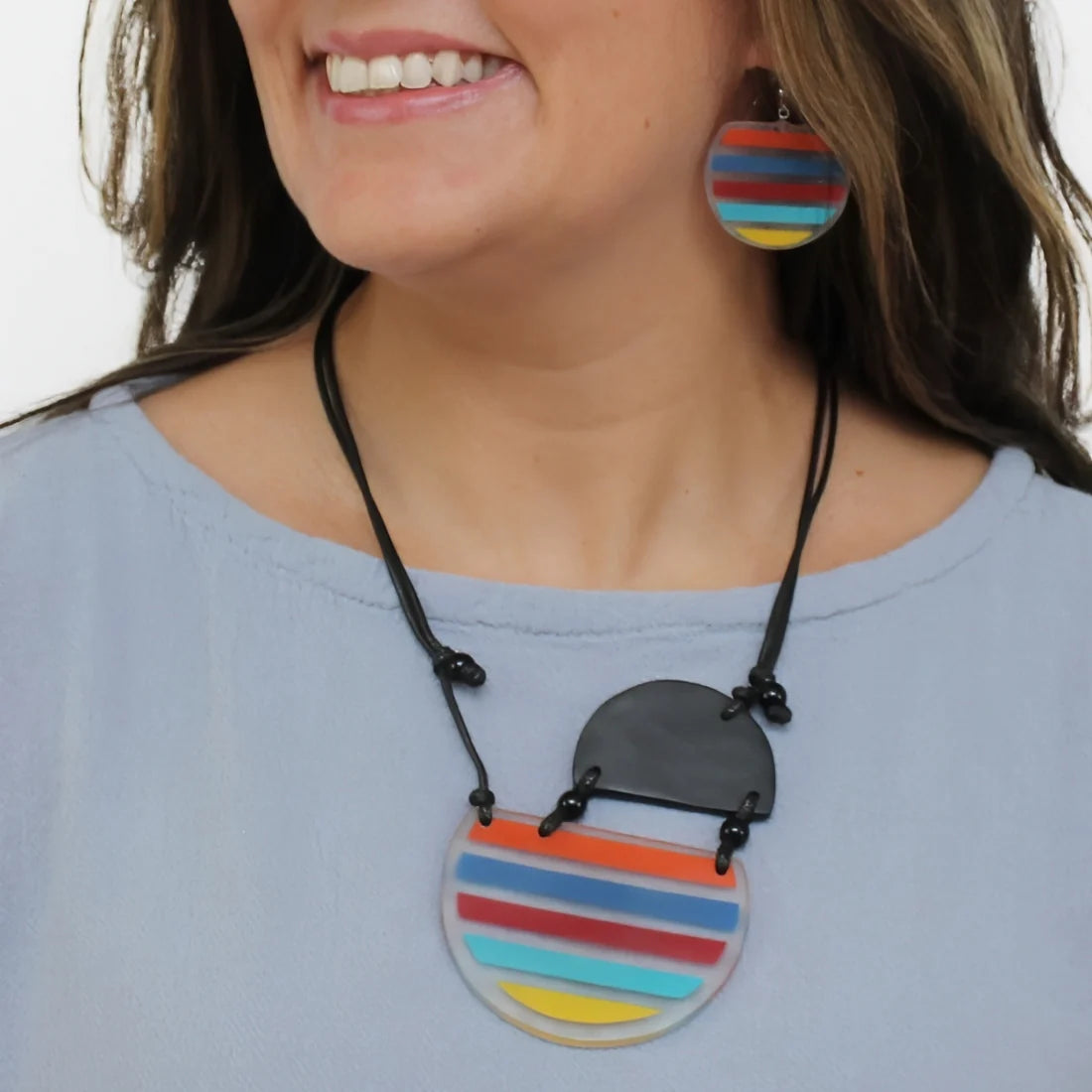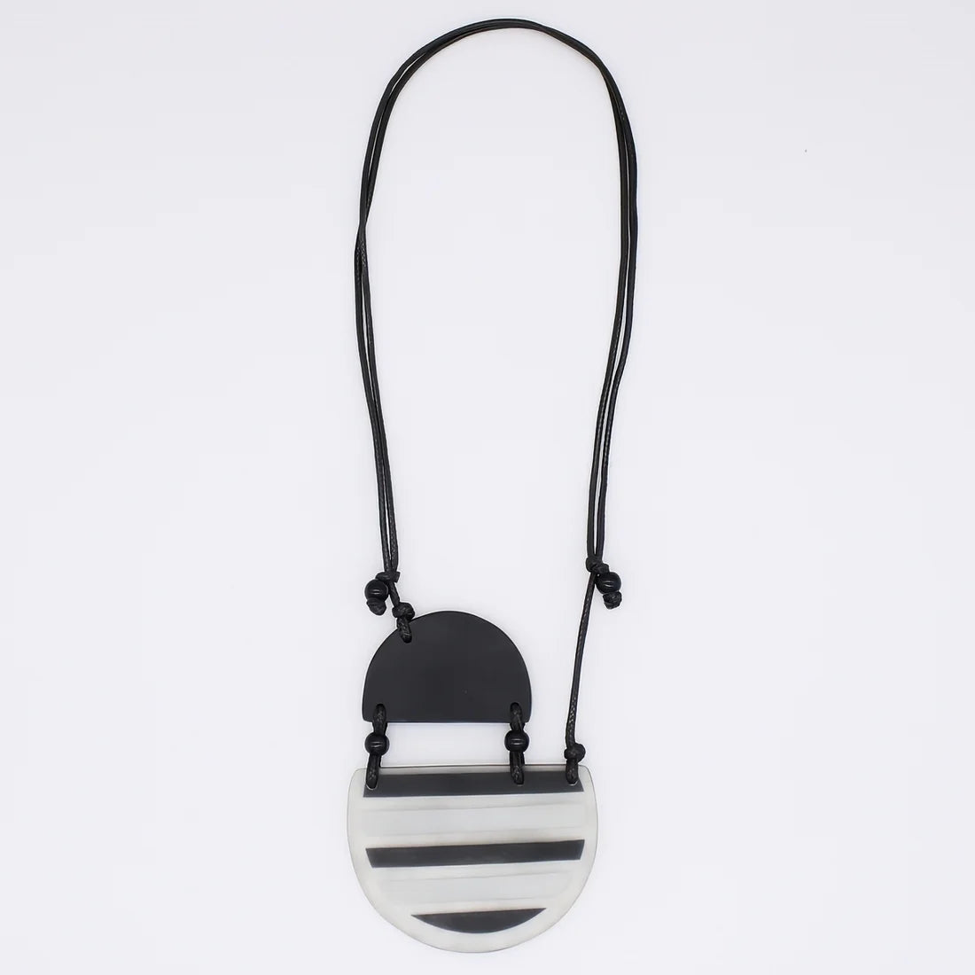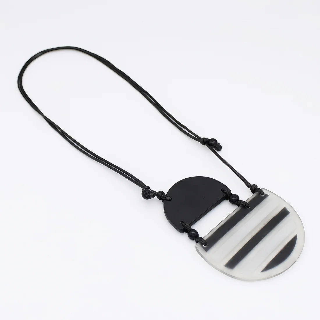 The Contemporary Eleni Pendant showcases hand-painted oval beads in black, white, and frosted resin, elegantly arranged on an adjustable wax cord. This versatile pendant offers a refined, modern look that complements both casual and formal ensembles with effortless sophistication.