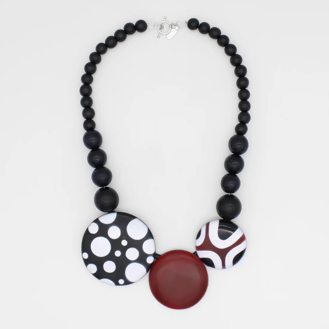 This eye-catching contemporary necklace features a strand of matte black wooden beads complemented by three distinctive circular pendants in painted resin. The design showcases a playful mix of patterns: a classic black and white polka dot disc, a rich burgundy solid circle, and a striking red and white geometric pattern disc. The contrasting colors and bold graphic elements create a modern, artistic statement piece that bridges minimalist and pop art aesthetics.