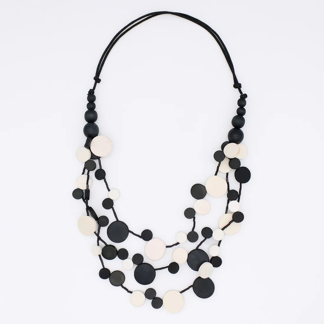 This triple strand, hues of green necklace is made to go with everything! Flat round wood beads are hand painted in a variety of bold colors and layered together on multiple strands of black wax cord. The adjustable neckline lets you choose the length you prefer. For a more casual look, wear over a simple tee, or fancy up that little black dress for a night out.